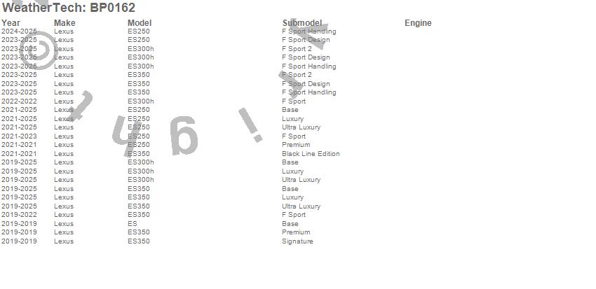 Below is an abbreviated list of applications for the BumperTopper.ES, ES250, ES300h, ES350, Lexus, 2025, 2024, 2023, 2022, 2021, 2020, 2019