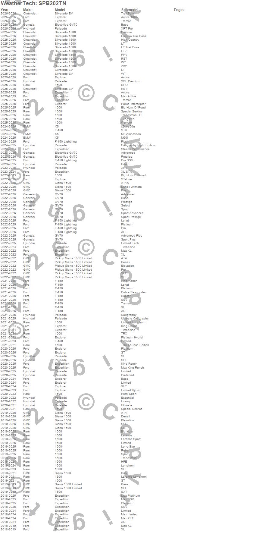 Below is an abbreviated list of applications for the Seat Protector.1500, Electrified GV70, Expedition, Explorer, F-150, F-150 Lightning, GV70, Palisade, Pickup Sierra 1500 Limited, Sierra 1500, Sierra 1500 Limited, Silverado 1500, Silverado EV, X5, BMW, Chevrolet, Ford, Genesis, GMC, Hyundai