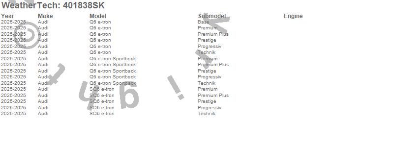 Below is an abbreviated list of applications for the Cargo Liner w/Bumper Protector.Q6 e-tron, Q6 e-tron Sportback, SQ6 e-tron, Audi, 2025