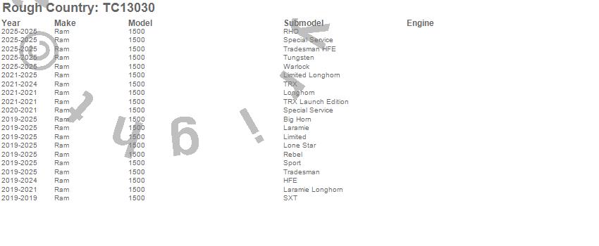 Brand: Rough CountryPart Number: TC13030Rocker Panel Guard Type: UPC: 840269973680