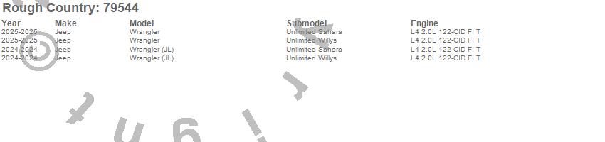 Brand: Rough CountryPart Number: 79544Lift Kit-Suspension w/Shock Type: 3.5 in LIft - C/A Drop - Stage 1 - M1R MonotubeUPC: 840269975011
