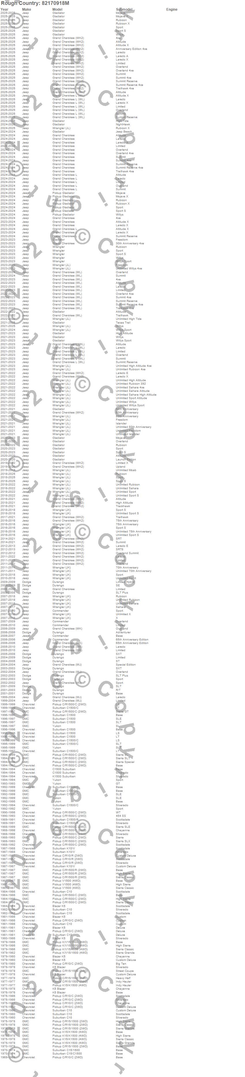 Below is an abbreviated list of applications for the Series 82 Wheel.Blazer K5, C10 Pickup, C10 Suburban, C15/C1500 Suburban, C1500 Pickup, C1500 Suburban, Commander, Durango, Gladiator, Grand Cherokee, Grand Cherokee (WJ), Grand Cherokee (WK), Grand Cherokee (WK2), Grand Cherokee (WL), Grand Cherokee L, Grand Cherokee L (WL), K1500 Pickup, K1500 Suburban, K5 Blazer, Pickup Gladiator
