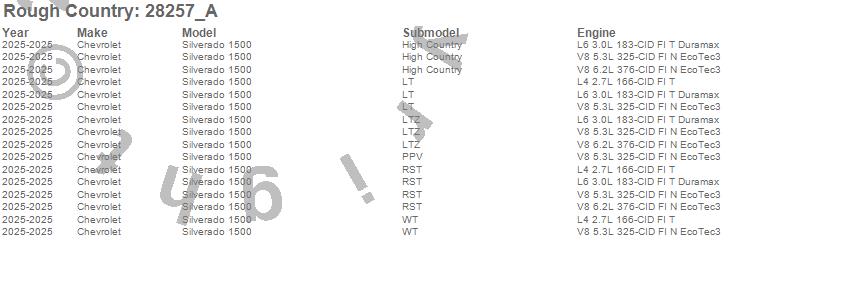 Below is an abbreviated list of applications for the Leveling Lift Kit w/Shocks.Silverado 1500, Chevrolet, 2025
