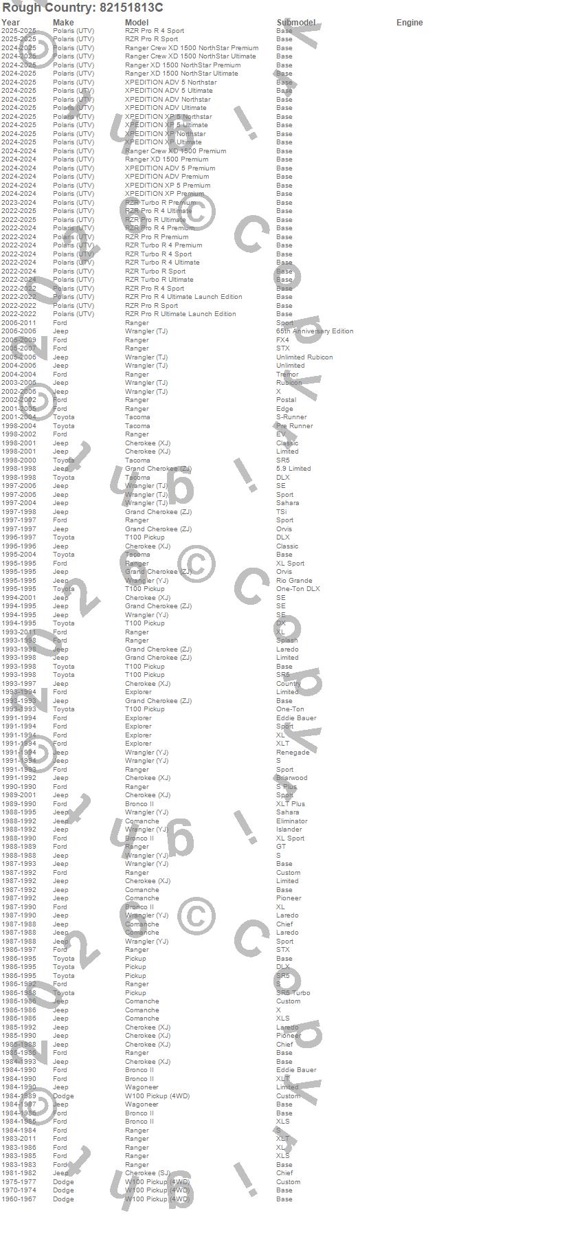 Below is an abbreviated list of applications for the Series 82 Wheel.Bronco II, Cherokee (SJ), Cherokee (XJ), Comanche, Explorer, Grand Cherokee (ZJ), Pickup, Ranger, Ranger Crew XD 1500 NorthStar Premium, Ranger Crew XD 1500 NorthStar Ultimate, Ranger Crew XD 1500 Premium, Ranger XD 1500 NorthStar Premium, Ranger XD 1500 NorthStar Ultimate, Ranger XD 1500 Premium, RZR Pro R 4 Premium, RZR Pro R 4 Sport, RZR Pro R 4 Ultimate, RZR Pro R 4 Ultimate Launch Edition, RZR Pro R Premium, RZR Pro R Sport