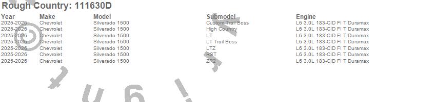 Brand: Rough CountryPart Number: 111630DLift Kit-Suspension w/Shock Type: 6 in Lift - Mono-Leaf Rear Spring - Strut Spacers - w/N3 Rear ShocksUPC: 840269978678