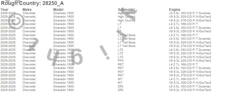 Below is an abbreviated list of applications for the Leveling Lift Kit w/Shocks.Silverado 1500, Chevrolet, 2025