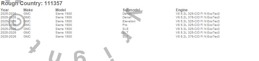 Brand: Rough CountryPart Number: 111357Lift Kit-Suspension w/Shock Type: 6 in Lift - Multi-Leaf Rear Spring - Vertex Coilovers - w/V2 Rear ShocksUPC: 840269978036