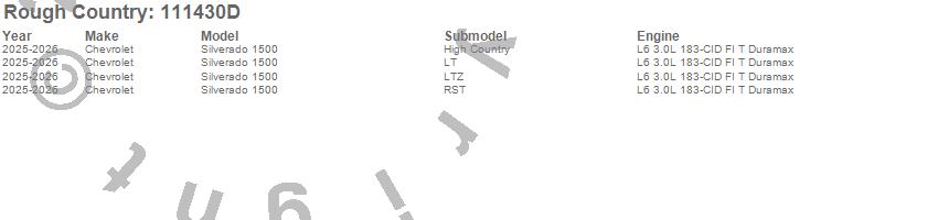 Brand: Rough CountryPart Number: 111430DLift Kit-Suspension w/Shock Type: 6 in Lift - Multi-Leaf Spring - Strut Spacers - w/N3 Rear ShocksUPC: 840269978098