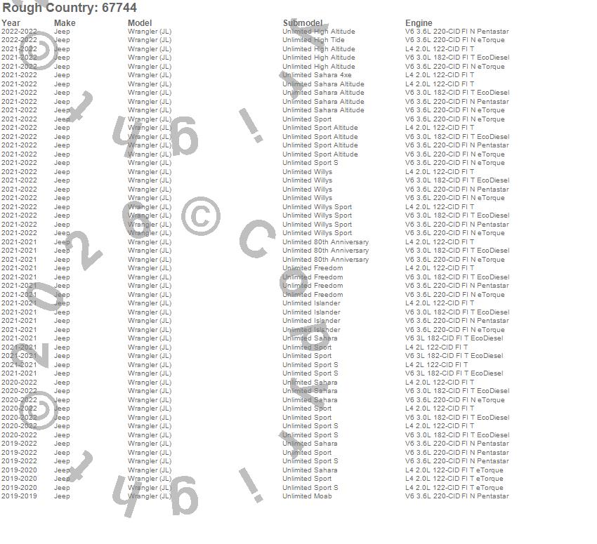 Below is an abbreviated list of applications for the Leveling Lift Kit w/Shocks.Wrangler (JL), Jeep, 2022, 2021, 2020, 2019