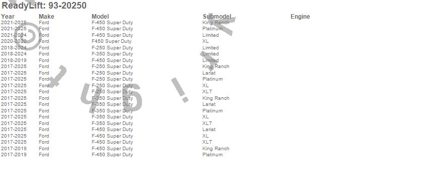 Below is an abbreviated list of applications for the Lift Kit w/Shocks.F-250 Super Duty, F-350 Super Duty, F-450 Super Duty, F450 Super Duty, Ford, 2025, 2024, 2023, 2022, 2021, 2020, 2019, 2018, 2017