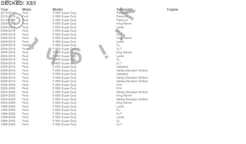 Below is an abbreviated list of applications for the DECKED Two Drawer Storage System.F-250 Super Duty, F-350 Super Duty, F-450 Super Duty, Ford, 2016, 2015, 2014, 2013, 2012, 2011, 2010, 2009, 2005, 2004, 2003, 2002, 2001, 2000, 1999