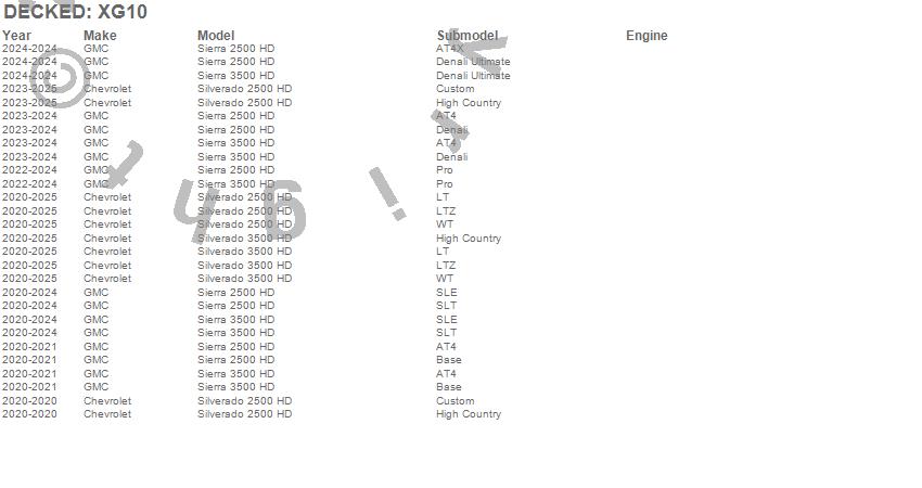 Below is an abbreviated list of applications for the DECKED Two Drawer Storage System.Sierra 2500 HD, Sierra 3500 HD, Silverado 2500 HD, Silverado 3500 HD, Chevrolet, GMC, 2025, 2024, 2023, 2022, 2021, 2020