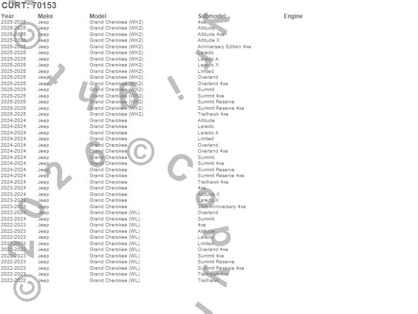 Below is an abbreviated list of applications for the Custom Tow Bar Base Plate.Grand Cherokee, Grand Cherokee (WK2), Grand Cherokee (WL), Jeep, 2025, 2024, 2023, 2022