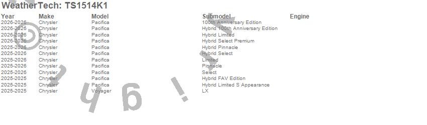 Below is an abbreviated list of applications for the WeatherTech SunShade Full Vehicle Kit.Pacifica, Voyager, Chrysler, 2026, 2025