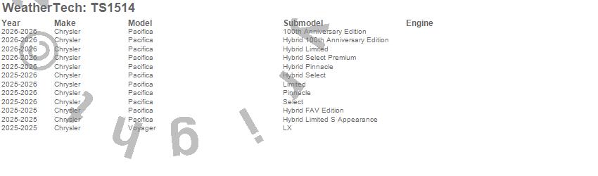 Below is an abbreviated list of applications for the WeatherTech SunShade.Pacifica, Voyager, Chrysler, 2026, 2025