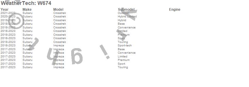 Below is an abbreviated list of applications for the All Weather Floor Mats.Crosstrek, Impreza, Subaru, 2023, 2022, 2021, 2020, 2019, 2018, 2017