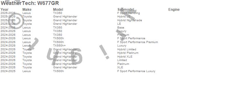 Below is an abbreviated list of applications for the All Weather Floor Mats.Grand Highlander, TX350, TX500h, TX550h+, Lexus, Toyota, 2026, 2025, 2024