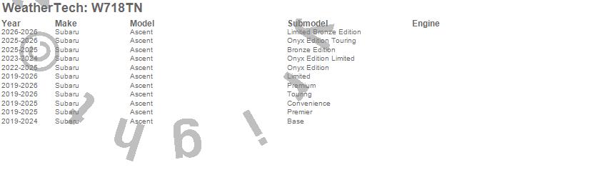 Below is an abbreviated list of applications for the All Weather Floor Mats.Ascent, Subaru, 2026, 2025, 2024, 2023, 2022, 2021, 2020, 2019