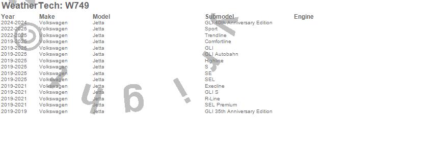 Below is an abbreviated list of applications for the All Weather Floor Mats.Jetta, Volkswagen, 2025, 2024, 2023, 2022, 2021, 2020, 2019