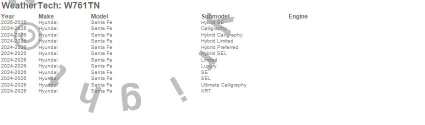 Below is an abbreviated list of applications for the All Weather Floor Mats.Santa Fe, Hyundai, 2026, 2025, 2024