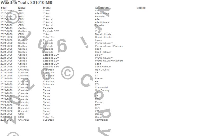 Below is an abbreviated list of applications for the Side Window Deflector.Escalade, Escalade ESV, Suburban, Tahoe, Yukon, Yukon XL, Cadillac, Chevrolet, GMC, 2026, 2025, 2024, 2023, 2022, 2021