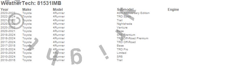 Below is an abbreviated list of applications for the Side Window Deflector.4Runner, Toyota, 2024, 2023, 2022, 2021, 2020, 2019, 2018, 2017, 2016, 2015, 2014, 2013, 2012, 2011, 2010