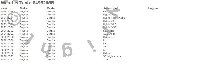Below is an abbreviated list of applications for the Side Window Deflector Set.Corolla, Toyota, 2026, 2025, 2024, 2023, 2022, 2021, 2020