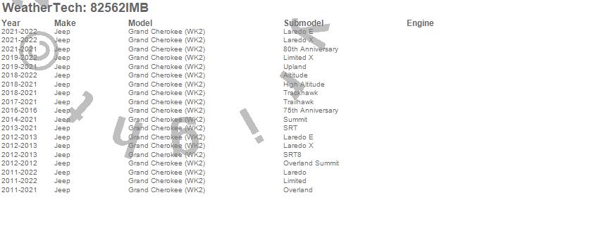 Below is an abbreviated list of applications for the Side Window Deflector Set.Grand Cherokee (WK2), Jeep, 2022, 2021, 2020, 2019, 2018, 2017, 2016, 2015, 2014, 2013, 2012, 2011