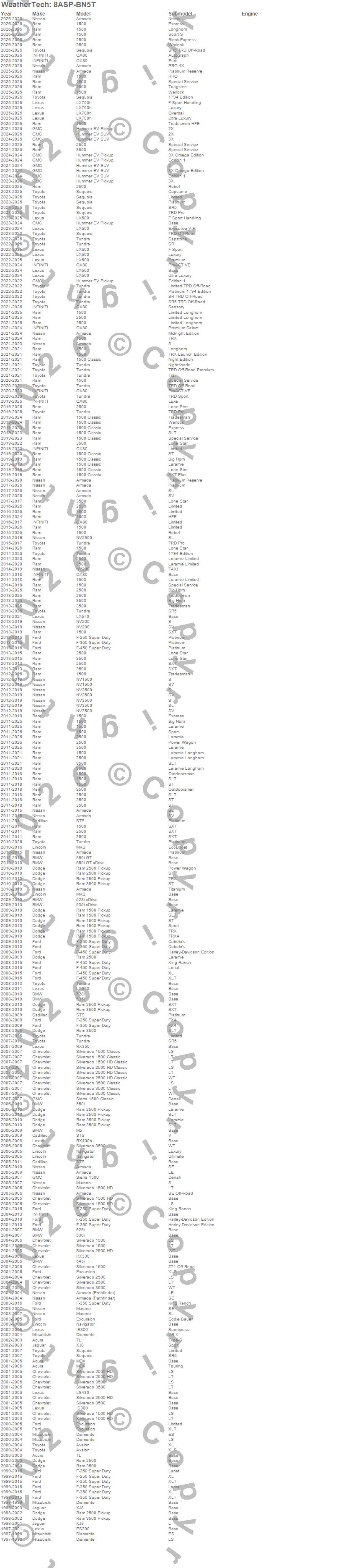 Below is an abbreviated list of applications for the Seat Protector.1500, 1500 Classic, 2500, 3500, 525i, 528i, 528i xDrive, 530i, 535i, 535i xDrive, 545i, 550i, 550i GT, 550i GT xDrive, Armada, Armada (Pathfinder), Avalon, Diamante, ES300, Excursion