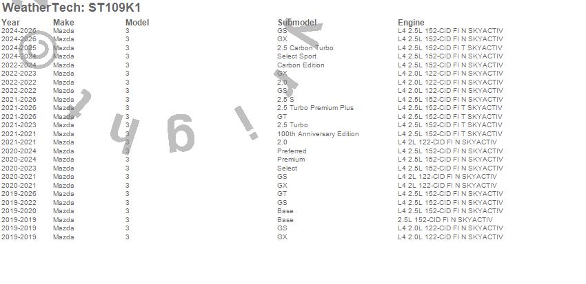 Below is an abbreviated list of applications for the Sill Protector.3, Mazda, 2026, 2025, 2024, 2023, 2022, 2021, 2020, 2019