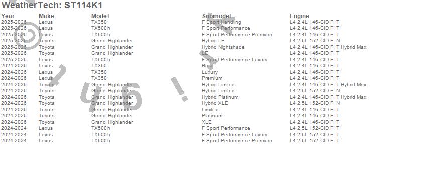 Below is an abbreviated list of applications for the Sill Protector.Grand Highlander, TX350, TX500h, Lexus, Toyota, 2026, 2025, 2024