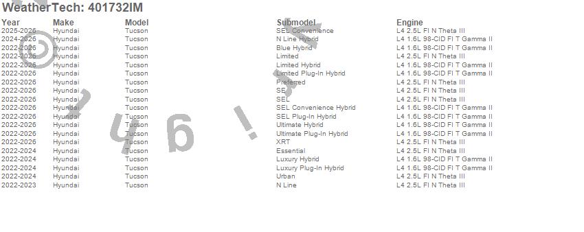 Below is an abbreviated list of applications for the SeatBack Cargo Liner HP.Tucson, Hyundai, 2026, 2025, 2024, 2023, 2022