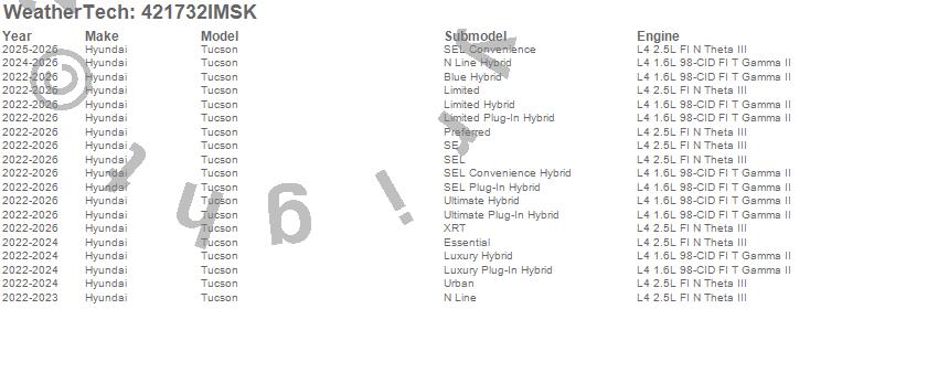 Below is an abbreviated list of applications for the SeatBack Cargo Liner HP w/Bumper Protector.Tucson, Hyundai, 2026, 2025, 2024, 2023, 2022