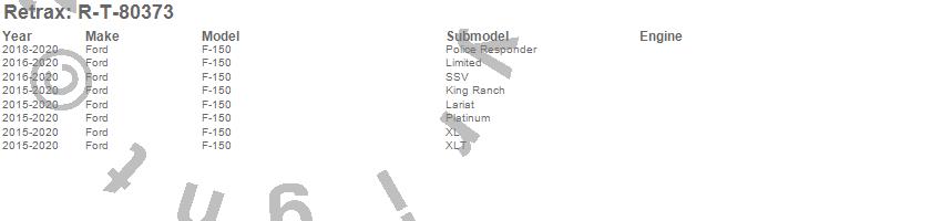 Below is an abbreviated list of applications for the Retrax Retractable FRC-4000 Tonneau Cover.F-150, Ford, 2020, 2019, 2018, 2017, 2016, 2015