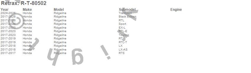 Below is an abbreviated list of applications for the Retrax Retractable FRC-4000 Tonneau Cover.Ridgeline, Honda, 2026, 2025, 2024, 2023, 2022, 2021, 2020, 2019, 2018, 2017
