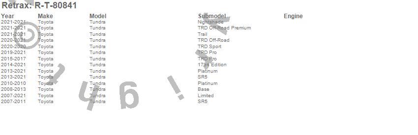 Below is an abbreviated list of applications for the Retrax Retractable FRC-4000 Tonneau Cover.Tundra, Toyota, 2021, 2020, 2019, 2018, 2017, 2016, 2015, 2014, 2013, 2012, 2011, 2010, 2009, 2008, 2007