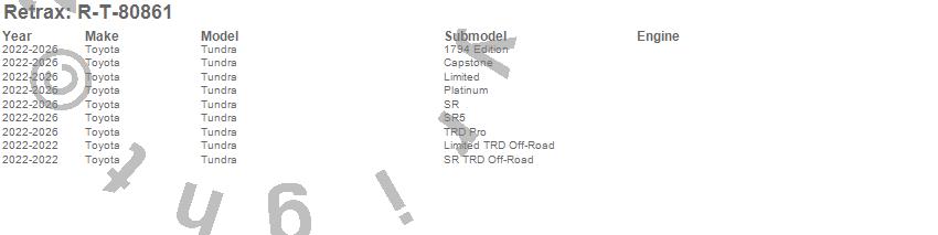 Below is an abbreviated list of applications for the Retrax Retractable FRC-4000 Tonneau Cover.Tundra, Toyota, 2026, 2025, 2024, 2023, 2022