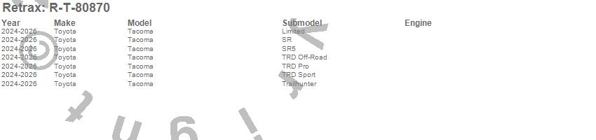 Below is an abbreviated list of applications for the Retrax Retractable FRC-4000 Tonneau Cover.Tacoma, Toyota, 2026, 2025, 2024