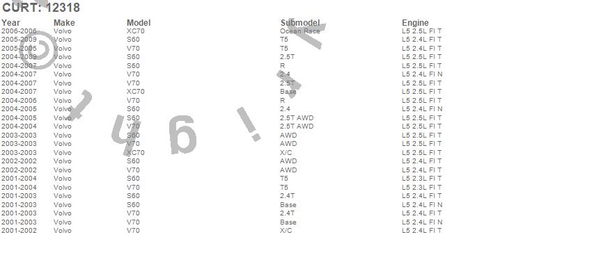 Below is an abbreviated list of applications for the Class II 1.25 in. Receiver Hitch.S60, V70, XC70, Volvo, 2009, 2008, 2007, 2006, 2005, 2004, 2003, 2002, 2001