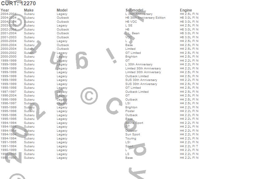 Below is an abbreviated list of applications for the Class II 1.25 in. Receiver Hitch.Legacy, Outback, Subaru, 2004, 2003, 2002, 2001, 2000, 1999, 1998, 1997, 1996, 1995, 1994, 1993, 1992, 1991, 1990