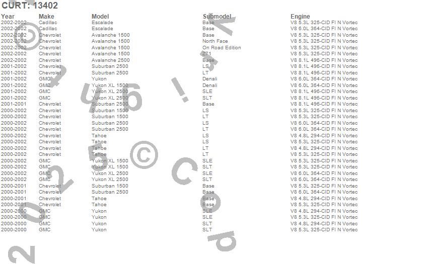 Below is an abbreviated list of applications for the Class III 2 in. Receiver Hitch.Avalanche 1500, Avalanche 2500, Escalade, Suburban 1500, Suburban 2500, Tahoe, Yukon, Yukon XL 1500, Yukon XL 2500, Cadillac, Chevrolet, GMC, 2002, 2001, 2000