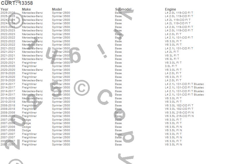 Below is an abbreviated list of applications for the Class III 2 in. Receiver Hitch.Sprinter 2500, Sprinter 3500, Dodge, Freightliner, Mercedes-Benz, 2025, 2024, 2023, 2022, 2021, 2020, 2019, 2018, 2017, 2016, 2015, 2014, 2013, 2012, 2011