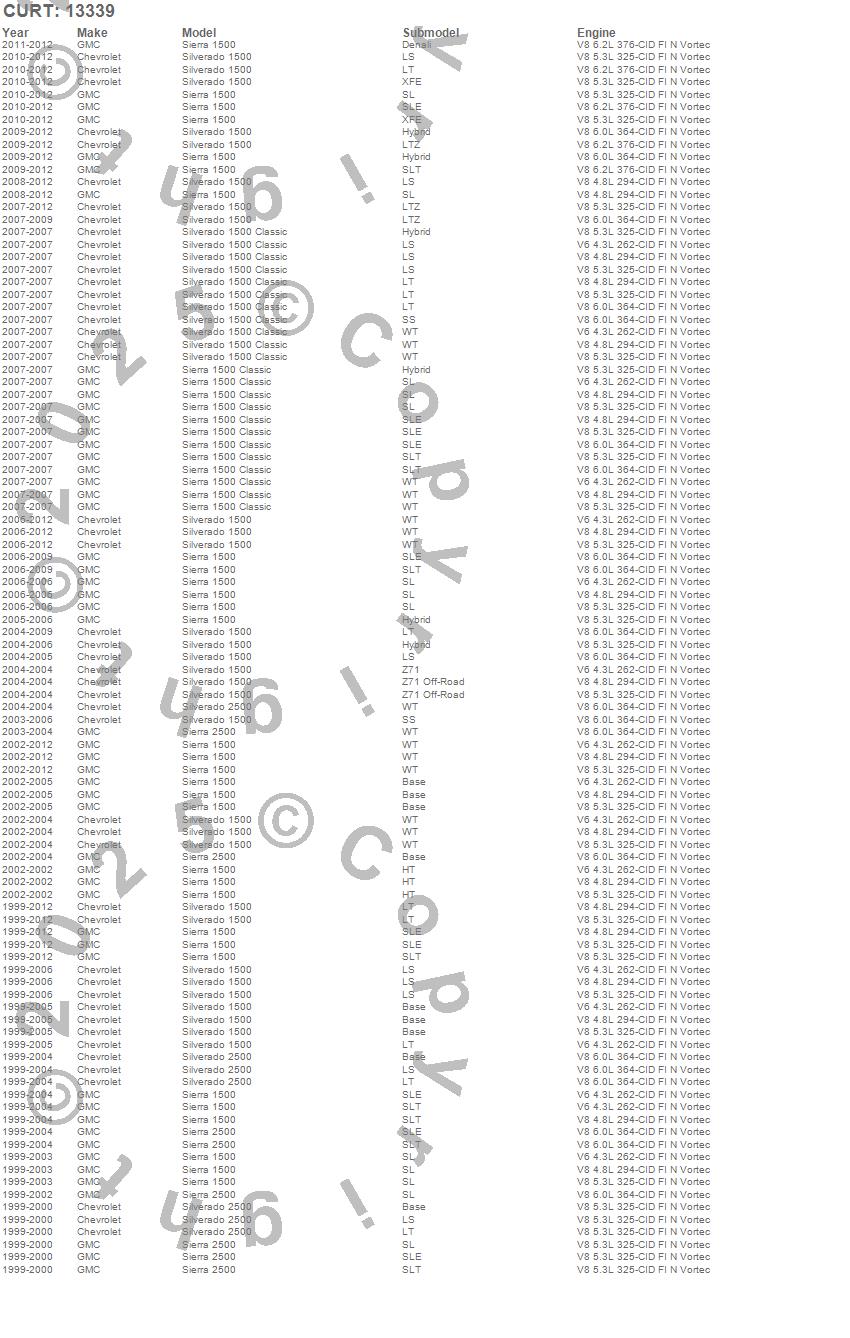 Below is an abbreviated list of applications for the Class III 2 in. Receiver Hitch.Sierra 1500, Sierra 1500 Classic, Sierra 2500, Silverado 1500, Silverado 1500 Classic, Silverado 2500, Chevrolet, GMC, 2012, 2011, 2010, 2009, 2008, 2007, 2006, 2005, 2004, 2003, 2002, 2001