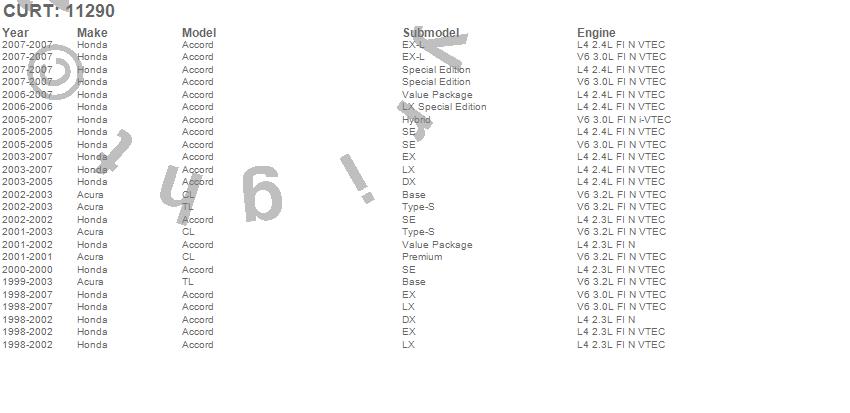 Below is an abbreviated list of applications for the Class I 1.25 in. Receiver Hitch.Accord, CL, TL, Acura, Honda, 2007, 2006, 2005, 2004, 2003, 2002, 2001, 2000, 1999, 1998