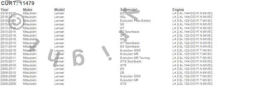 Below is an abbreviated list of applications for the Class I 1.25 in. Receiver Hitch.Lancer, Mitsubishi, 2017, 2016, 2015, 2014, 2013, 2012, 2011, 2010, 2009, 2008