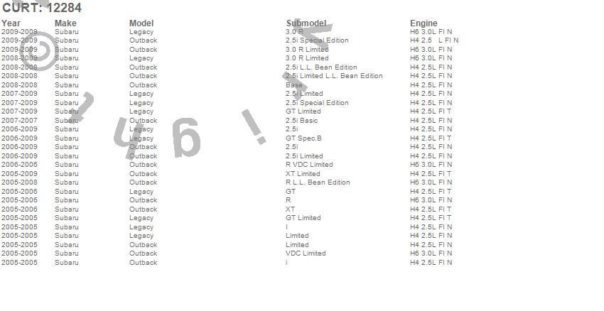 Below is an abbreviated list of applications for the Class II 1.25 in. Receiver Hitch.Legacy, Outback, Subaru, 2009, 2008, 2007, 2006, 2005