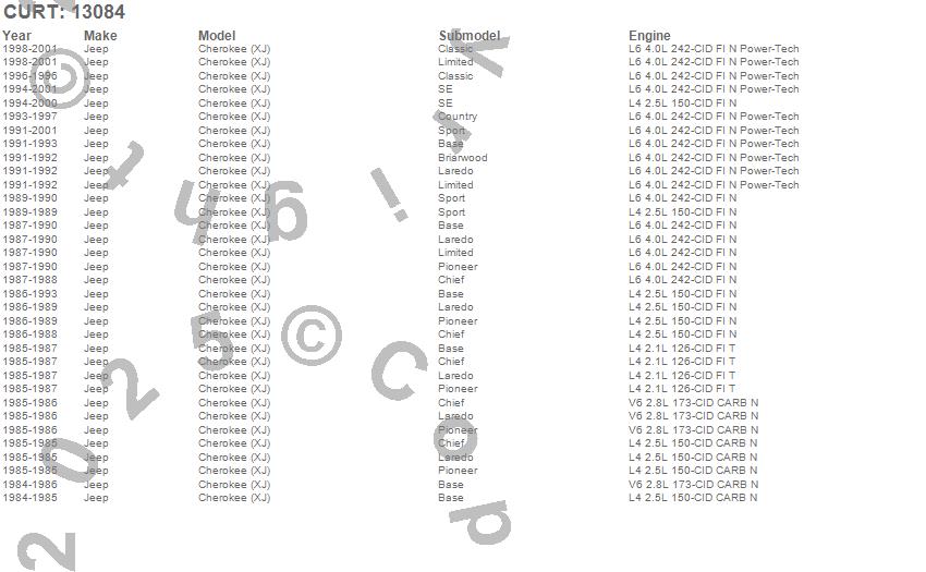 Below is an abbreviated list of applications for the Class III 2 in. Receiver Hitch.Cherokee (XJ), Jeep, 2001, 2000, 1999, 1998, 1997, 1996, 1995, 1994, 1993, 1992, 1991, 1990, 1989, 1988, 1987, 1986, 1985, 1984