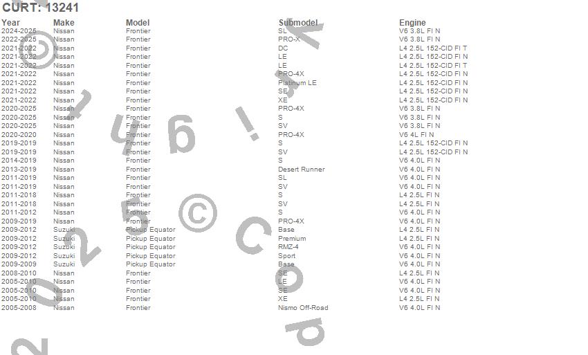 Brand: CURTPart Number: 13241Trailer Hitch Type: Rear - 5000lbs. Gross Trailer Weight - 500lbs. Tongue Weight - 8000lbs. Weight Distributing - 800lbs. Weight Distributing Tongue WeightUPC: 612314132416
