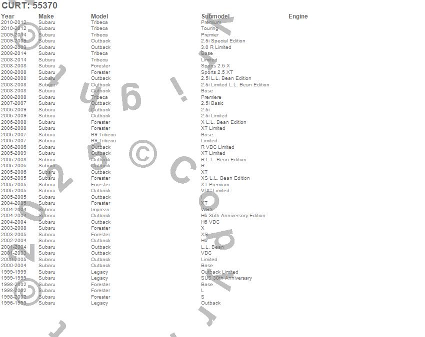 Below is an abbreviated list of applications for the Replacement OEM Tow Package Wiring Harness.B9 Tribeca, Forester, Impreza, Legacy, Outback, Tribeca, Subaru, 2014, 2013, 2012, 2011, 2010, 2009, 2008, 2007, 2006, 2005, 2004, 2003, 2002