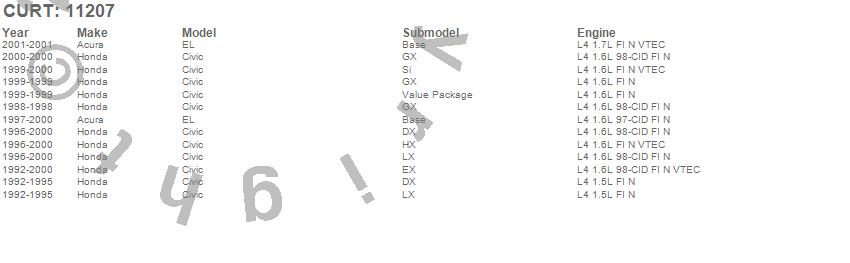 Below is an abbreviated list of applications for the Class I 1.25 in. Receiver Hitch.Civic, EL, Acura, Honda, 2001, 2000, 1999, 1998, 1997, 1996, 1995, 1994, 1993, 1992